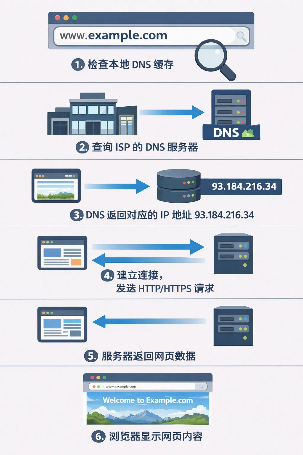- 用户在浏览器地址栏输入域名(我现在站在图书馆里,脑子里想着书本《人类简史》)