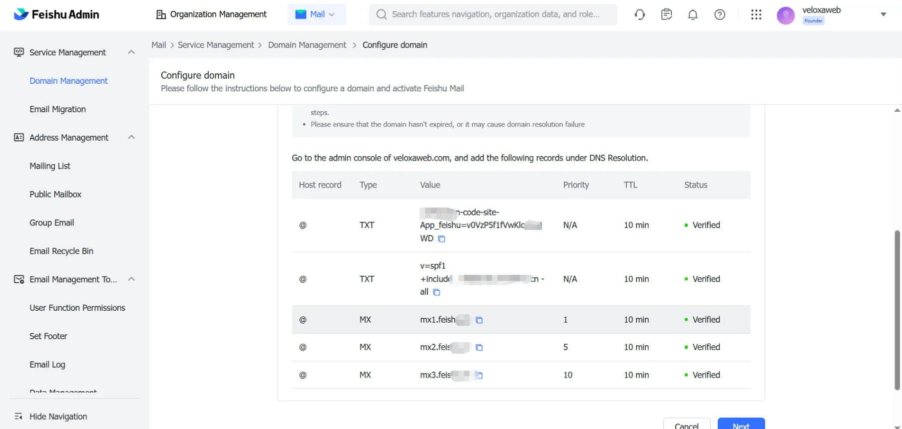 值:飞书给的 MX 地址