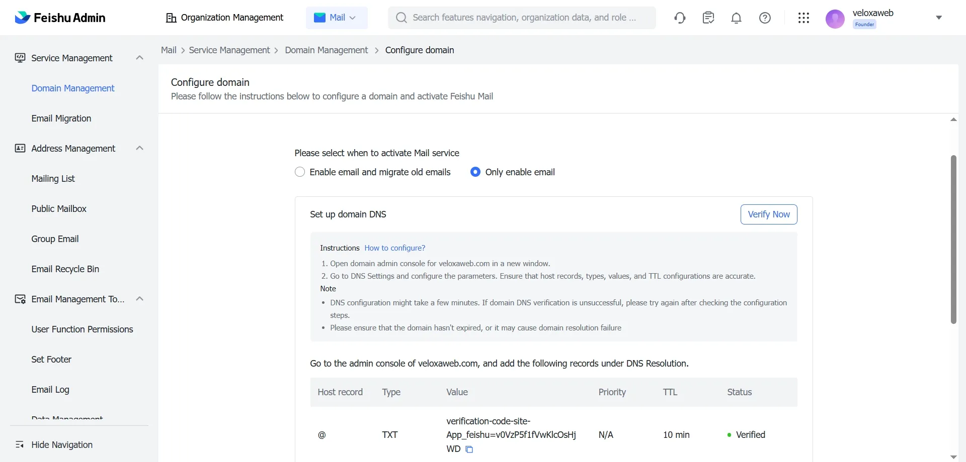 飞书搭建域名邮箱流程: