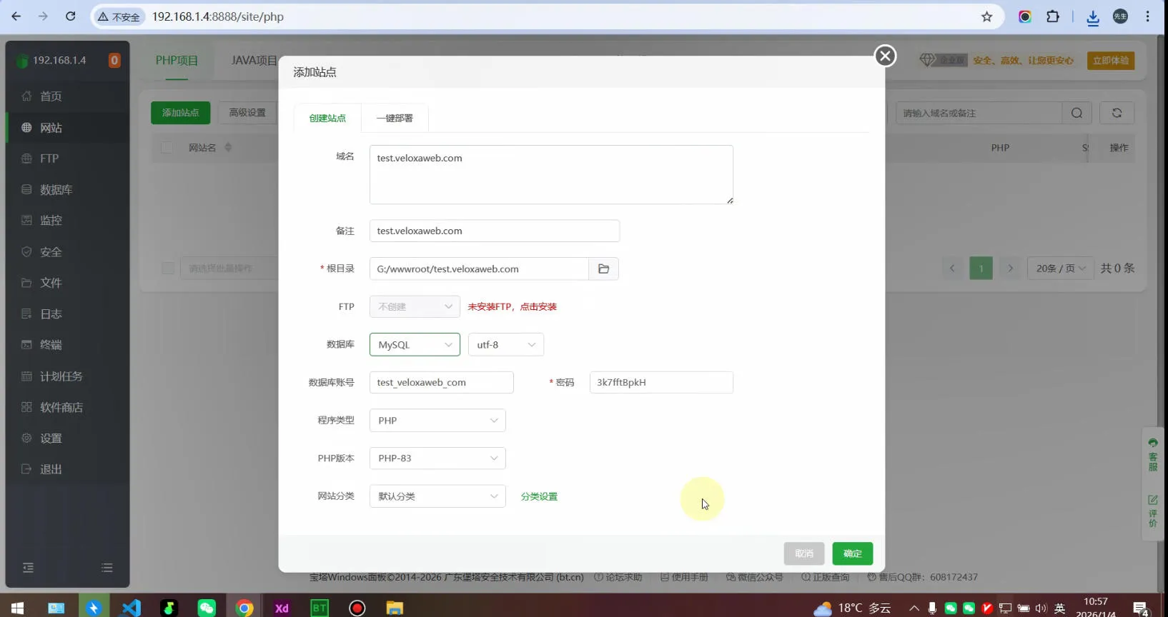 - 在宝塔面板中新建站点,选择好php创建好数据库然后确认。