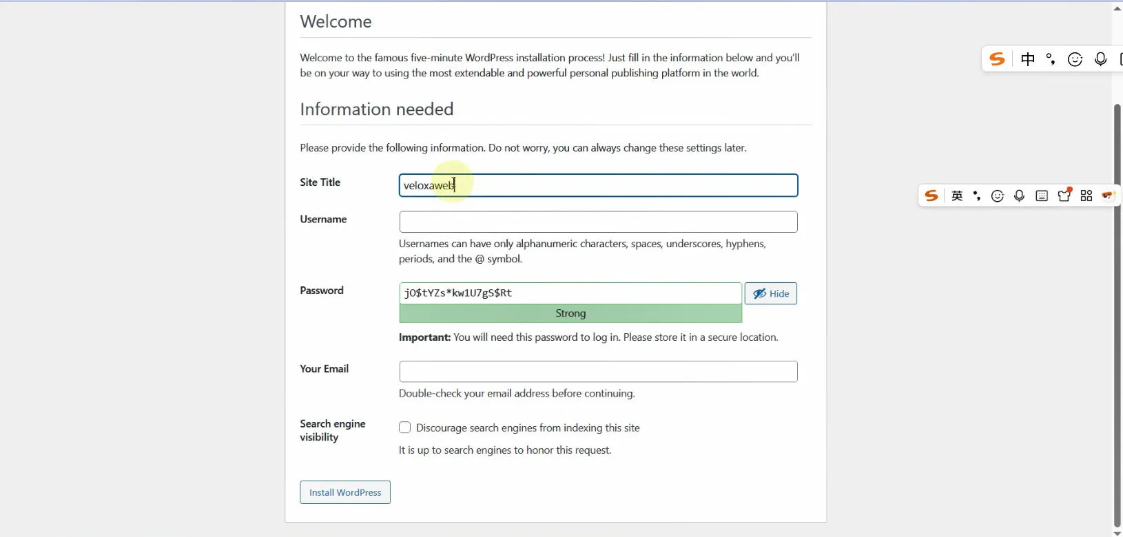 - 输入网站的标题、用户名、密码、邮箱等信息、搜索引擎可见性不要勾选。👉如何注册域名邮箱