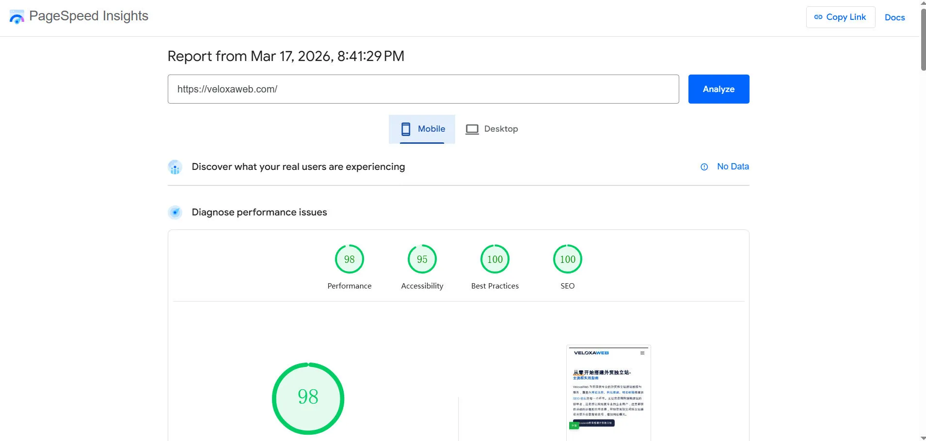 注意:测速分数高 ≠ 用户体验好/SEO效果好,一个网站是否成功和设计+代码+SEO、SEM+代码紧密相关。