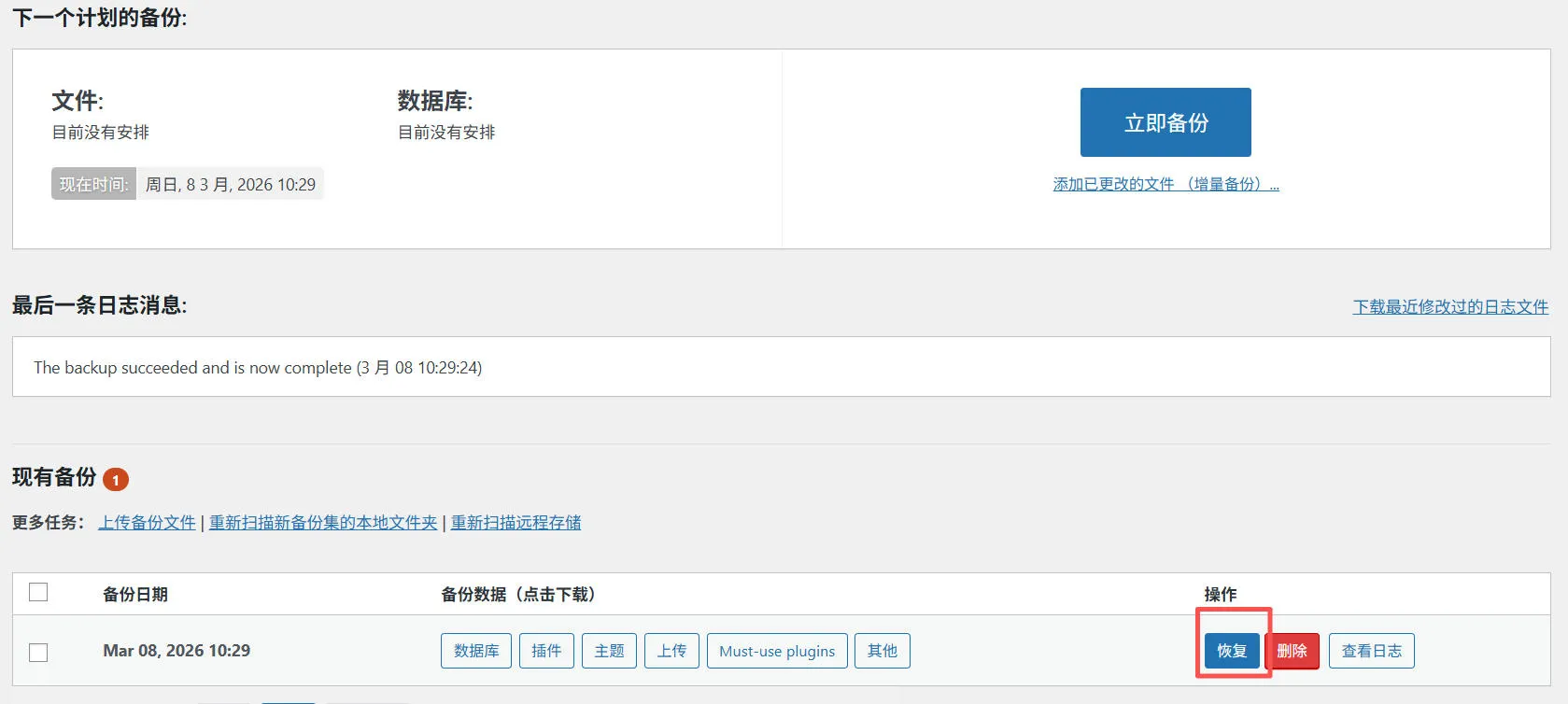 如果提前做好 WordPress备份,恢复网站只需要几分钟。